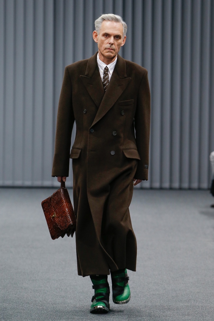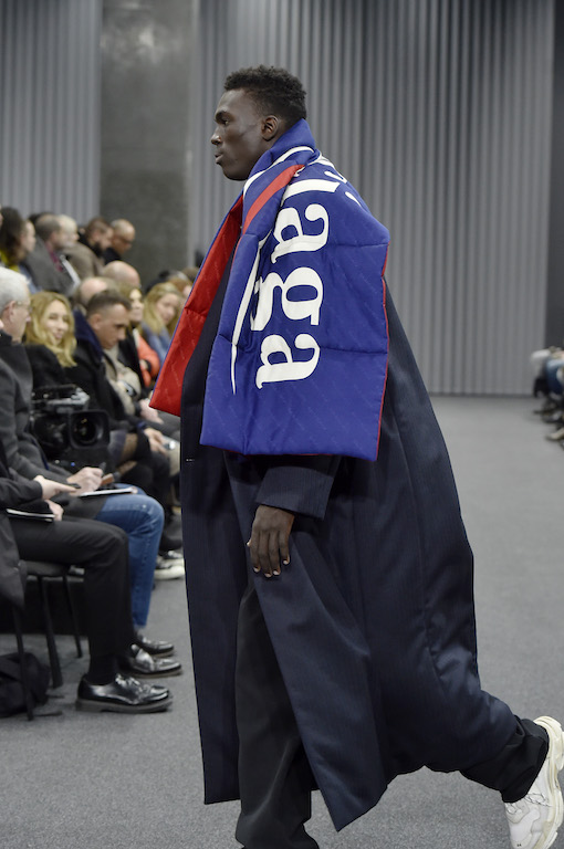 新一季的主题是围绕那些朝九晚五的上班族工装而来。当然,那些本是老旧的、古板的西装、双排扣大衣和风衣仍旧经过典型的Demna Gvasalia式处理,或是以超低腰裤装出现、亦或是搭配从他为Balenciaga创作的首个女装系列就出现过的填充围巾等配饰。