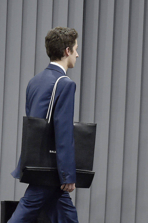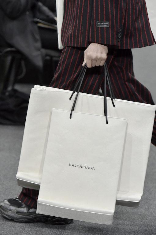 这一季的Balenciaga男装系列上最引人瞩目的便是那款印着品牌黑白双色Logo的手提购物袋。