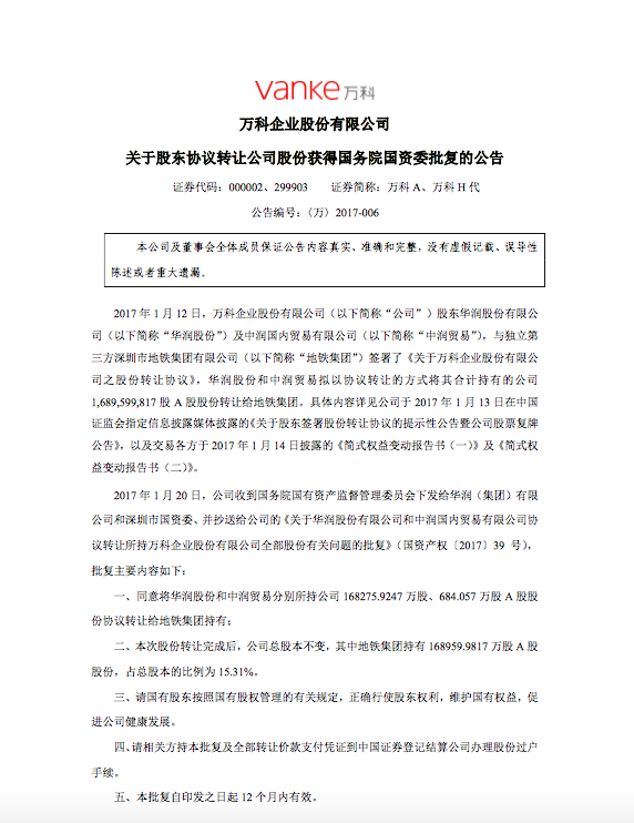 1月20日晚,万科A发布公告称:2017年1月20日,公司收到国务院国有资产监督管理委员会下发给华润(集团)有限公司和深圳市国资委、并抄送给公司的《关于华润股份有限公司和中润国内贸易有限公司协议转让所持万科企业股份有限公司全部股份有关问题的批复》(国资产权〔2017〕39号),批复主要内容如下: