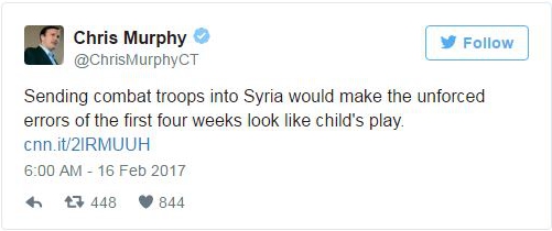 目前已有多名民主党人士在Twitter上发文,对向叙利亚派遣地面部队表示反对。