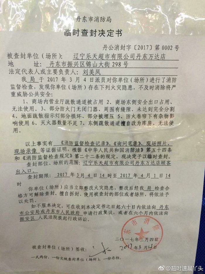 据路透社报道,该发言人没有透露其他更多细节。但国内媒体报道称,这间位于与朝鲜一江之隔的辽宁省丹东市的超市,于上周六(3月4日)因为不符消防要求被查封。辽宁省丹东市公安消防发布的查封决定书显示,因存在“营业厅消防疏散通道被占用、部分安全出口被占用、灭火器数量不够”等7项消防隐患而被查封。