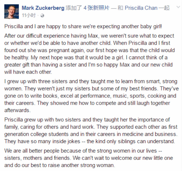 北京时间3月10日上午,Facebook的CEO马克·扎克伯格在自己的Facebook和Instagram上发文,宣布自己与妻子Priscilla Chan将迎来第二个孩子,他们希望这将会是另一个女儿。
