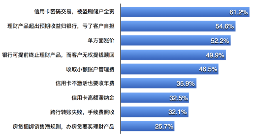 信用卡乱收费也成为消费者投诉的重灾区。调查结果显示,消费者在进行信用卡消费时,“信用卡息费计收规则不透明”、“刷卡次数或额度未达标,收取高额年费”、“溢缴款不计息,取出多存的钱收手续费”名列消费者“吐槽”前三名,占比分别为55.1%、52.3%、50%。