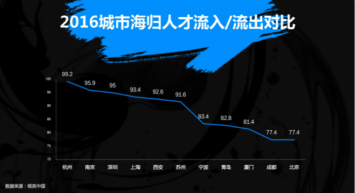 领英大数据显示,2016年毕业归国的留学生数量比2010年增长了四倍多,出国与回国人数比例达到1.28比1。其中高端人才回国的现象明显,拥有10年以上工作经验、在某个领域可以领衔创新的35至45岁中高层管理人才归国数量在2016年达到了2010年的两倍,目前国家重点项目学科带头人中的海归比例超过70%。