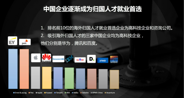 领英中国解决方案服务总监王欢在发布会上介绍,根据领英平台的数据显示,2016年排名前十位的海归人才就业首选企业是高科技企业和咨询公司,而跻身前十的三家中国本土企业分别为华为、腾讯和百度。然而和国际跨国企业相比,中国企业在雇主品牌的建立与宣传上仍有不足之处,在“领英全球最具吸引力公司榜单”上,华为排名第28,是榜单中唯一一家进入前30的中国本土企业。实际上,华为也是领英平台上第一家粉丝量超过百万级的中国本土企业。