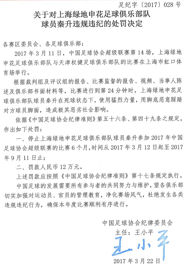 北京时间3月24日下午,中国足协官方宣布多项处罚决定,对上海绿地申花队队员秦升停赛半年,孙世林停赛两场,上海绿地申花足球俱乐部被通报批评;对广州恒大主教练斯科拉里禁赛一场,巴西人也将会缺席主场对阵上海上港的中超比赛。