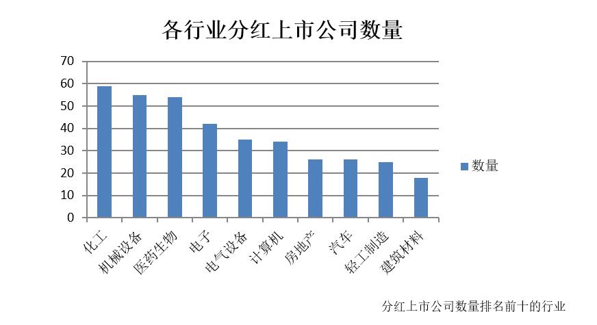 从分红公司所属行业角度来看,化工、机械设备以及医药生物位居前三甲,数量分别达到59家、55家和54家。排名前十的行业还有电子、电气设备、计算机、房地产、汽车、轻工制造以及建筑材料。
