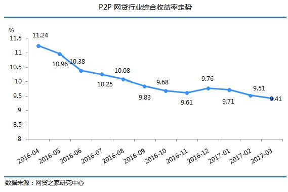 网贷收益率继续下滑创新低。2017年3月,网贷行业综合收益率为9.41%,环比下降了10个基点,同比下降了222个基点。不过,下降速度有所放缓。