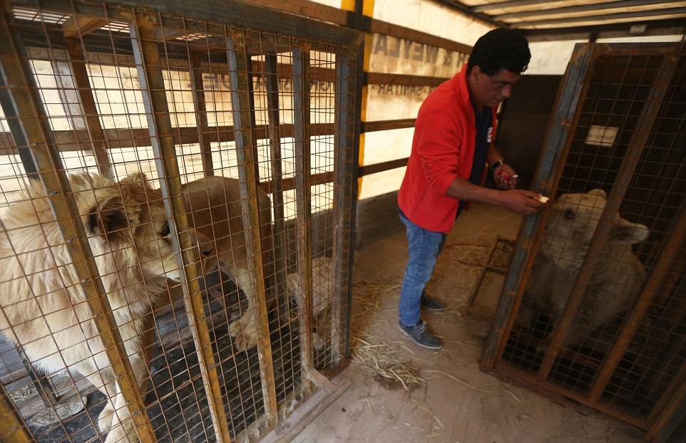 伊拉克政府军今年年初夺取摩苏尔东部地区后,“四爪”国际野生动物救助组织派兽医探访遭遗弃的摩苏尔动物园,发现由于几个星期没人喂食,园中动物大都已经死亡,只有雌熊“卢拉”和雄狮“辛巴”幸存,但满身污秽。3月底,该组织设法将这两头动物运往国外救治。在办完所有手续后,“卢拉”和“辛巴”最终前往约旦避难。