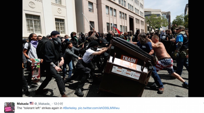 在伯克利发生的抗议活动打着另一个旗号:“爱国日”抗议,这场抗议活动最终变成了特朗普支持者和反对者之间的暴力冲突,已导致十几人受伤,21人被捕。据《芝加哥时报》报道,两个阵营的人互相投掷石块,用木棍攻击对方,一个大型垃圾桶还被当成了“攻城槌”。现场还有身穿安全防护衣的民兵组织加入保护支持特朗普的抗议者。伯克利警方身穿防暴头盔,试图将特朗普的支持者和反对者分开。