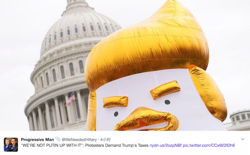 而在纽约,大量活动人士、喜剧演员以及参议员在抗议活动中发表讲话。网络上流传的照片和视频显示,一些抗议现场出现了充气小鸡形象,用意是讽刺总统特朗普害怕公布其纳税记录。