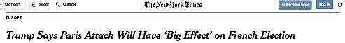 【特朗普:巴黎枪击案将对法国选举产生重大影响】美国总统特朗普周五称,巴黎发生的枪击案将对周日的法国大选产生重大影响。特朗普没有提及11位总统候选人中的任何人,他在推特上写道,“法国人民已经坚持不住了,这将对总统选举产生重大影响!”法国大选选情胶着,四名候选人势头不相上下。