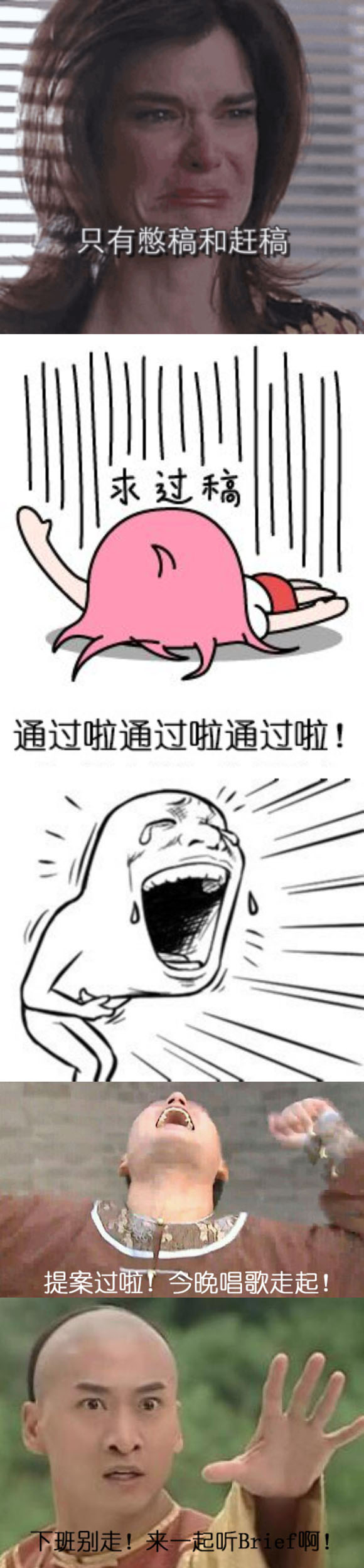 “我爱工作”、“你们不爱工作吗?”、“放开我,让我加班”、“加班到摇摆”、“加班到昏厥”、“我还能加班”……,一声声看似积极向上的呐喊背后是对忙碌现实的不满、讽刺、控诉、无奈和自我麻痹。