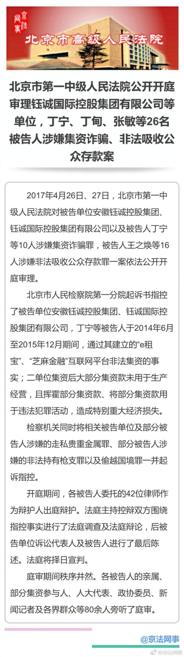 2017年4月26日、27日,北京市第一中级人民法院对被告单位安徽钰诚控股集团、钰诚国际控股集团有限公司以及被告人丁宁等10人涉嫌集资诈骗罪,被告人王之焕等16人涉嫌非法吸收公众存款罪一案依法公开开庭审理。
