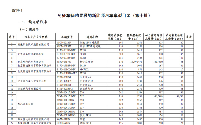 附:免征车辆购置税的新能源汽车车型目录(第十批)