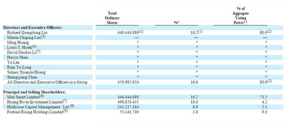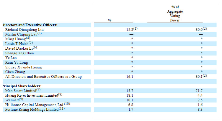 京东集团CEO刘强东为第二大股东,共持有452,044,989股,持股比例15.8%,其中15.7%的股权通过Max Smart Limited持有,这部分股权拥有投票权71.7%,Fortune Rising Holdings Limited持股1.7%,拥有8.3%的投票权,这部分投票权归刘强东所有,这使得刘强东共拥有80.0%的投票权。这意味着,刘强东仍然对京东拥有绝对的控制权。