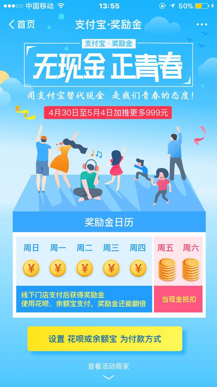 除了打广告,支付宝还在发鼓励金,希望无现金变成年轻人的一种消费态度。今年4月30日,支付宝针对年轻人的无现金推广就开始了。截止今天,为期5天的活动中,你用花呗或者余额消费后,有更多机会抽到999元的翻倍奖励金。这种撞大运的奖励玩法,上一次见到还是过年抽福卡的时候。