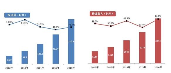 2016年同城、异地、国际/港澳台快递业务量占全部比例分别为23.7%、74.3%和2%,业务收入占全部比例分别为14.2%、52.8%和10.8%。