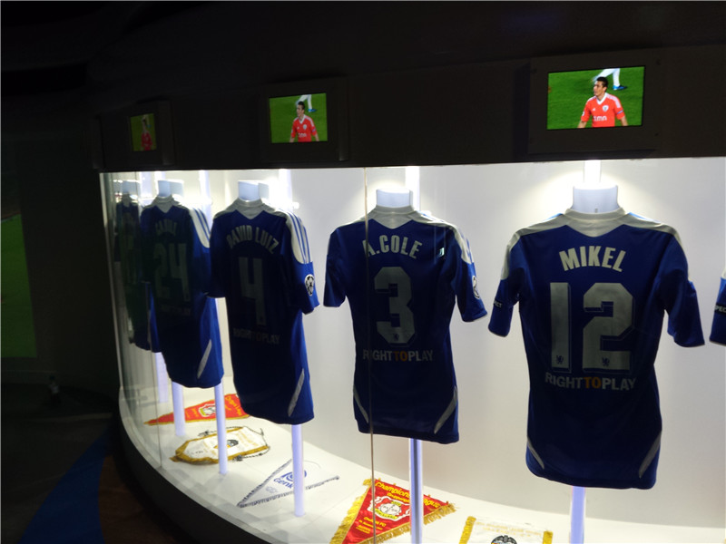 当时,与我同行的朋友已经旅居英国多年,欧洲许多豪门的球场,都曾留下他的足迹。刚一进入切尔西博物馆,朋友就忍不住吐槽道:“这队果然是没历史啊,就这么点地方啊……”或许,这也是阿布拉莫维奇想要修建新球场的原因之一吧。球衣、奖杯、老照片,展览的内容并不算新鲜,而其中最醒目的单元,莫过于2012年欧冠决赛。除了橱窗内存放着“大耳朵杯”的复制品,循环着播放比赛录像,就连所有登场球员的球衣也被以螺旋回转的方式一一陈列。