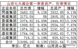 截至2017年4月末,山西七大煤企(焦煤、同煤、阳煤、潞安、晋煤、晋能和山煤)披露2017年第一季度财务报告,经山西资本圈统计,截至3月末,七大煤企负债总额为13086.16亿元,相较于去年同期的12102.78亿元,增长8.13%。