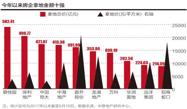 中原地产研究中心统计数据显示,截至5月10日,2017年拿地最多的25大房企拿地总金额超过5599.1亿,同比涨幅超100%。其中有21家房企的拿地支出超过百亿。