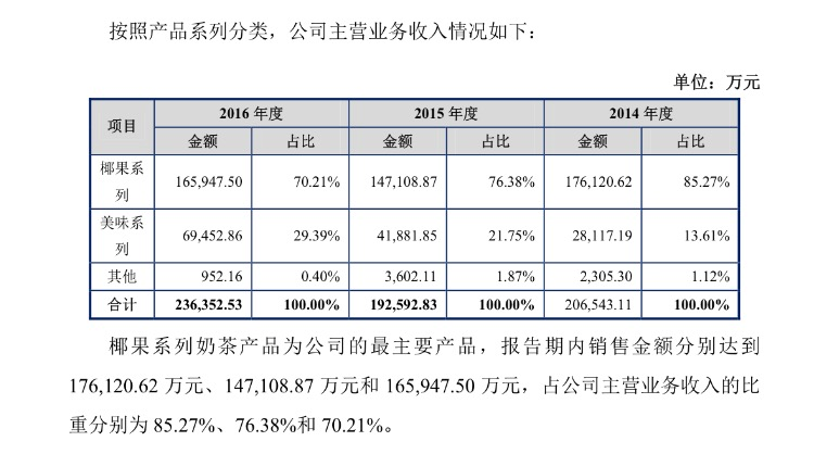 根据招股书,2014年-2016年期间,作为主营业务的杯装奶茶产品占香飘飘全部营业收入的98.68%、98.68%和98.90%。 其中椰果系列奶茶产品2014年-2016年销售金额占主营业务收入的比重分别高达85.27%、76.38%和70.21%。