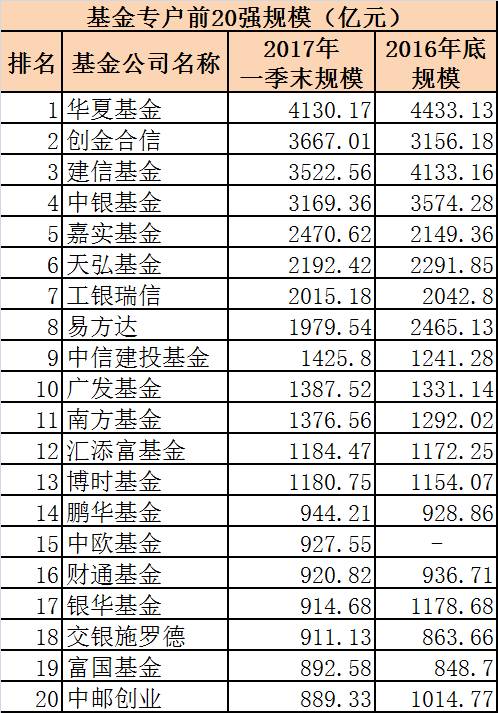 另一家专户规模增长较多的基金公司是中欧基金,去年底还在20名开外,一季末以927.55亿元的规模位列第15名,浦银安盛基金公司则滑出20名以外。