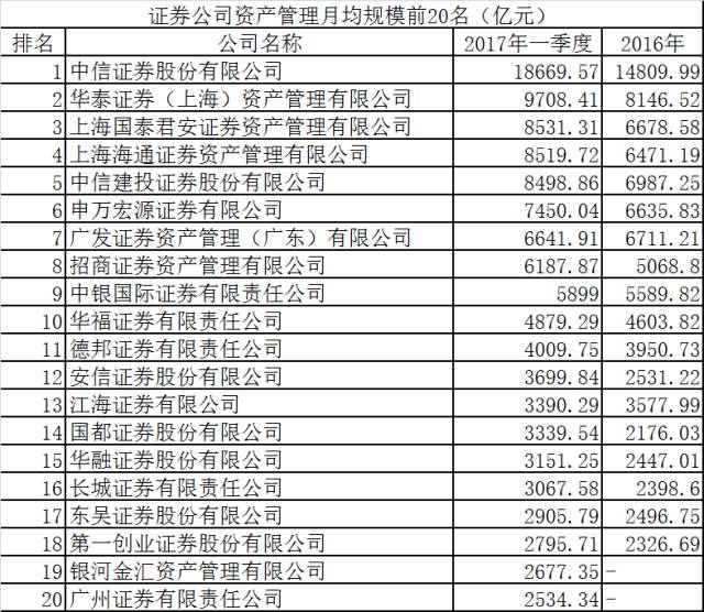 从排名上看,银河金汇资产管理和广州证券的月均规模在一季度跻身前20,上海光大证券资产管理有限公司和齐鲁证券(上海)资产管理有限公司则被挤出前20名。