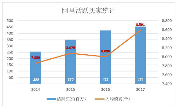 2017财年,电商平台的活跃买家总数为4.54亿,近三年的平均复合增长率为21.2%。