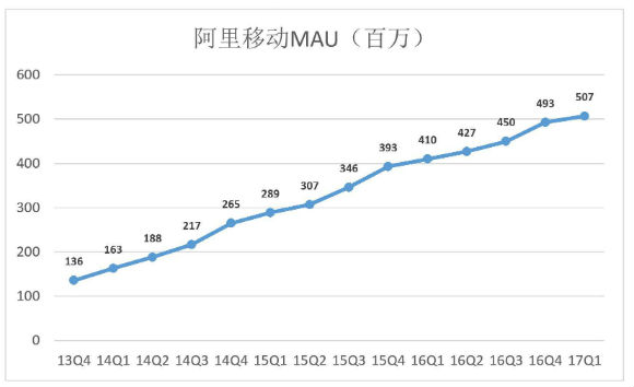 财报显示:2017自然年Q1阿里营收385.8亿、同比增长60%;季度末,移动端月活用户达5.07亿;2017财年交易总金额(GMV)约为3.8万亿;财年营收1582.7亿元,同比增长56%。