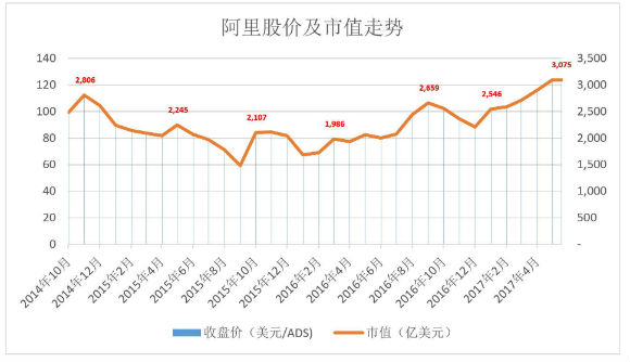 近期中概股的最大看点就是阿里股价创新高、过往12个月涨幅超过50%、市值站上3000亿美元(注2017年5月19日收盘价123.22美元,市值3075亿美元)。