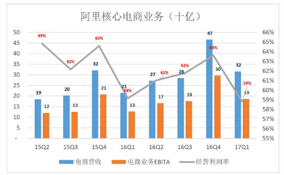 照此算来,2017财年,阿里电商业务非GAAP利润率为61.6%。