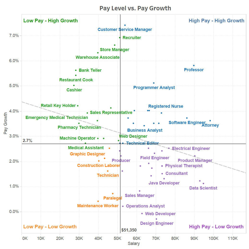可以发现,工资与加薪幅度之间有着轻微的负相关关系,低加薪幅度通常伴随着高工资,而低工资工作通常会有着较高的增长机会。比如,美国现在薪水最高的职位——数据科学家,其一年的工资中位数为94,944美元。然而这门职业的加薪幅度仅为1.1%,远远低于全国平均加薪幅度(2.7%)。