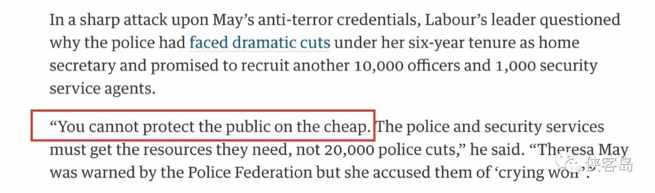 如今,英国大选日渐临近,借着维稳不利,老对手工党党魁科尔宾也猛踩特蕾莎·梅,其在讲话中抨击梅说:“你不可能省着钱就保护了公众”。说白了,便宜没好事这话到哪都成立。