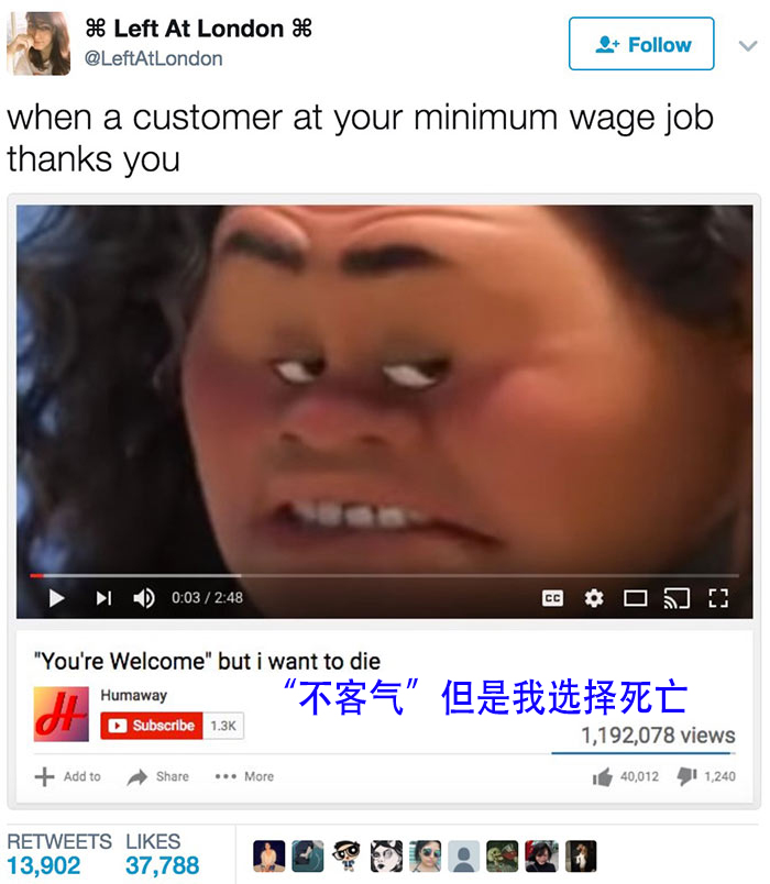 “当你拿着不可能再低的薪水上班而一位顾客对你说‘谢谢’的时候。”