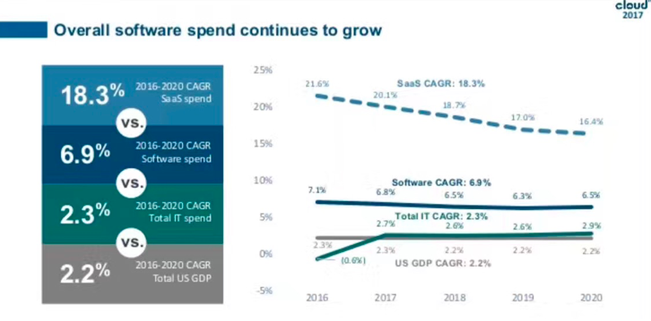 Gartner的报告显示,全球SaaS行业年化增长保持在20%,而整个软件行业的增长是7%。