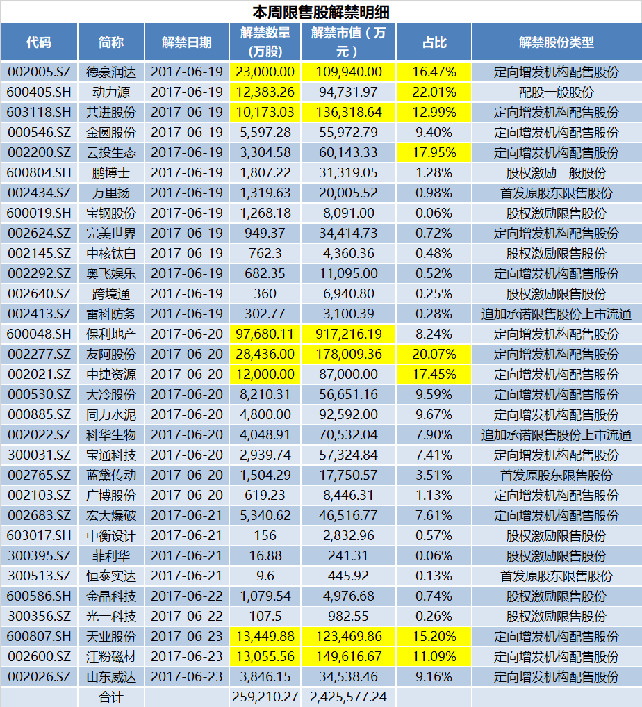 本周解禁规模超过10亿元的公司6家,分别是保利地产、友阿股份、德豪润达、天业股份、江粉磁材和共进股份。