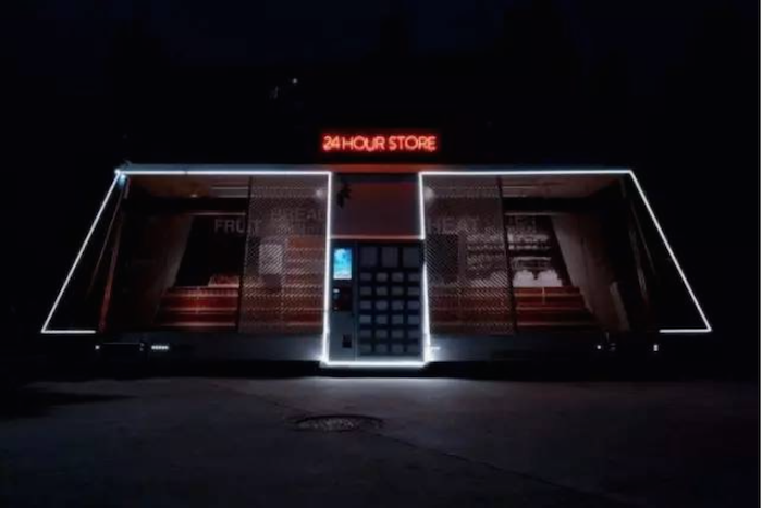 Moby 移动便利店从远处看就像一个不规则的玻璃盒子,在盒子里有各种各样的商品,而它有几个特性非常有未来感: