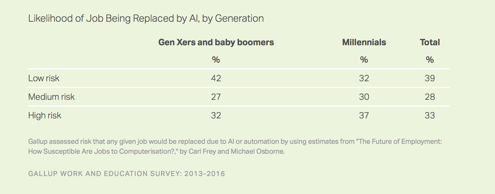 盖洛普调研结果显示,千禧一代实际上是最被人工智能和自动化威胁的群体,因为他们当中的多数正在有可能被新技术取代的岗位上。37%的千禧一代正在干有高自动化取代风险的工作,而这一比例在X世代和婴儿潮一代中只有32%。