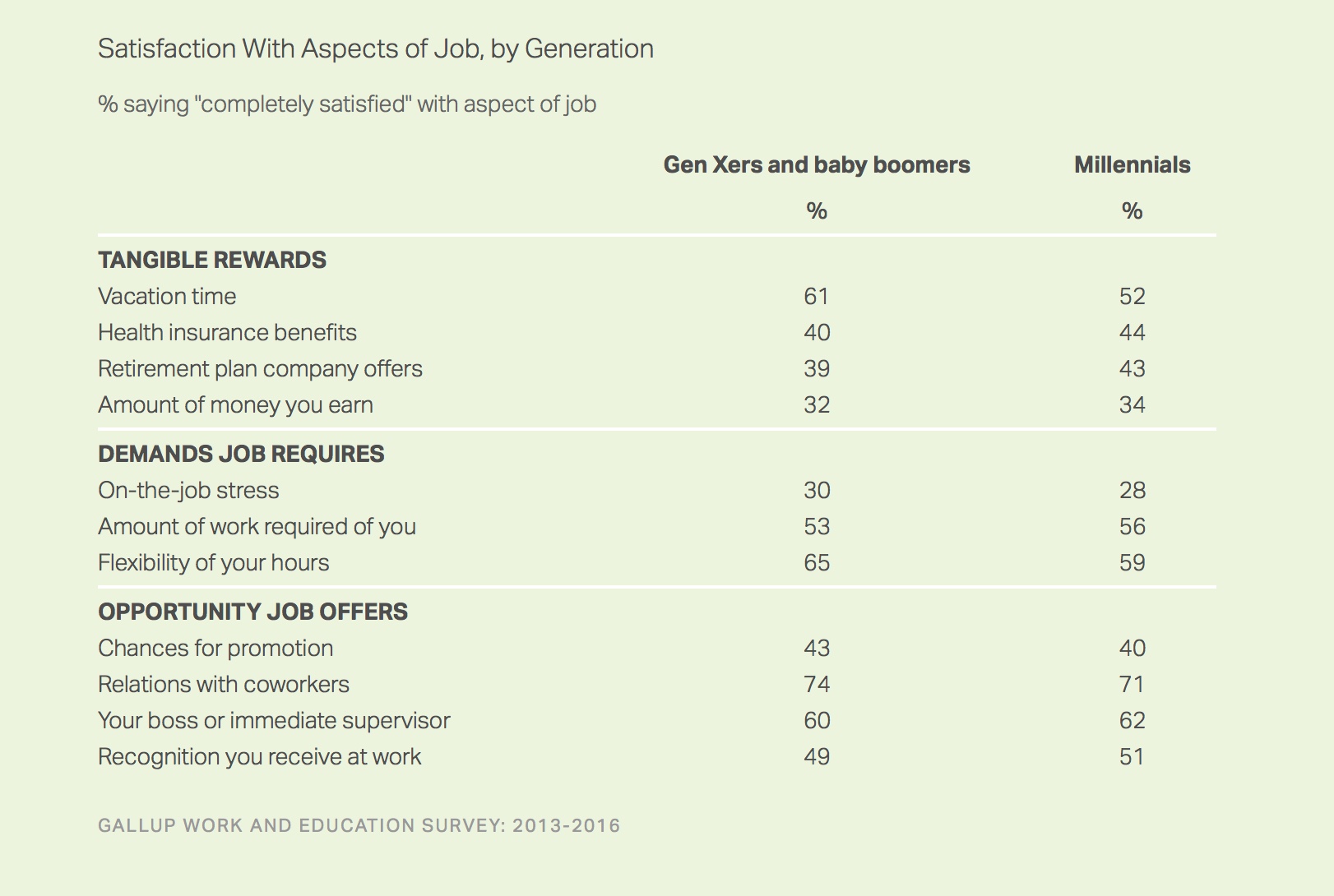 但盖洛普的最新调研指出,千禧代员工爱跳槽并不完全因为他们对自己的工作不满意。事实上,无论是在工作回报、工作内容职责还是职业机会,千禧代员工的满意度或多或少都和X世代员工和婴儿潮员工保持同一水平。