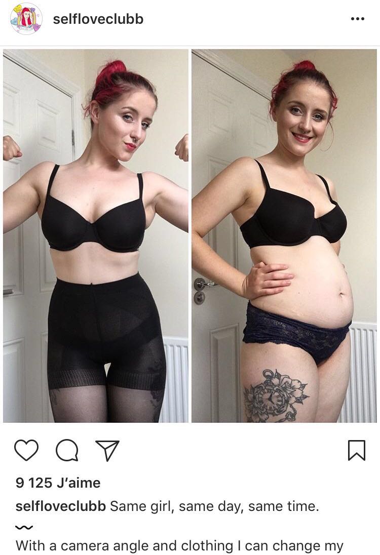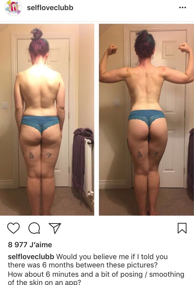 “如果我告诉你,这是6个月前/后对比图,你会信吗?如果我又告诉你,这两张之前其实就隔了6分钟呢?我只不过换了个姿势,再用app磨了下皮。”