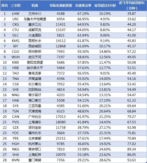 千万级机场的出港准点率中,兰州中川67.19%、乌鲁木齐地窝堡66.95%和重庆江北64.93%位列前三甲。相比5月,上海浦东机场摆脱倒数第一排名,上海虹桥位列倒数第二。