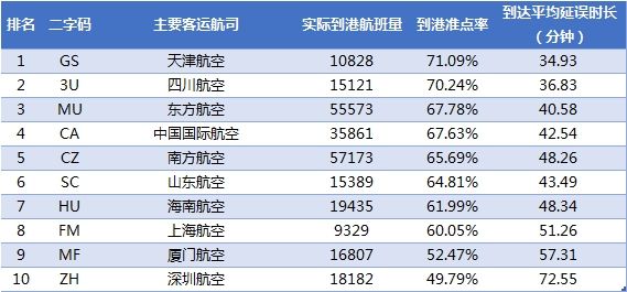 航空公司到港准点率方面,飞常准根据国内航空公司2016年全年的实际执飞航班量划分,日均执行航班在250架次(含)以上的航空公司为国内十大主要客运航空公司;日均执行航班在250架次以下的航空公司为国内其他客运航空公司。