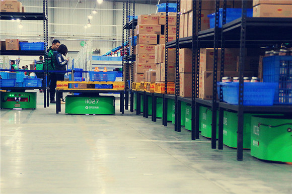 在北京五环外一座仓库内,数十条纵横交错的黑色直线,把仓库地面切割成围棋棋盘一样的形状,20台银灰色的仓储机器人,沿着棋盘忙碌地穿梭,在它们身旁堆放着50个两米多高的货架。一台机器人钻入了其中一个货架下方,并将它缓慢抬升几厘米,又沿着固定线路把货架搬到了拣选工人的身边。