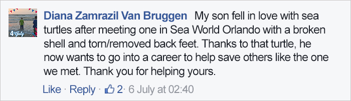 戴安娜·扎姆拉齐尔·范·布鲁根(Diana Zamrazil Van Bruggen):自从我儿子在奥兰多海洋世界里看到了一只龟甲破损、后足移位的海龟之后他就喜欢上了海龟。也是因为那只海龟,现在他想要将帮助别的受伤海龟作为他的一项事业。谢谢你拯救了这只箱龟。