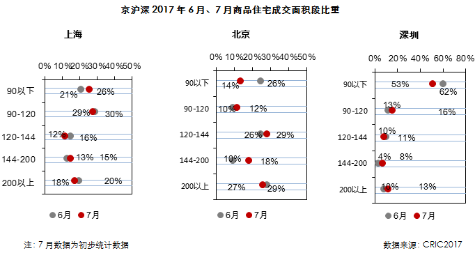 从面积段分布看,144-200平方米的大户型产品成交占比全部上升。90平方米以下产品除上海外均有下滑,且下滑程度超9个百分点,但深圳90平方米以下产品占比仍保持在50%以上,占市场较大比例。而144-200平方米产品成交占比全部上升,其中北京上升最明显,较上月增加8个百分点。