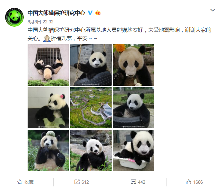 据中国大熊猫保护研究中心官方微博发布的消息称,“所属基地人员熊猫均安好,未受地震影响”。