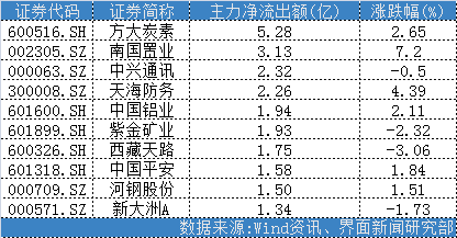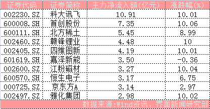 科大讯飞(002230.SZ)、首创股份(600008.SH)、北方稀土(600111.SH)成为两市主力净流入最高的三只个股,其主力净流入额分别为10.91亿元、7.35亿元、5.45亿元。其中,科大讯飞、首创股份均以涨停报收。值得一提的是,今日大部分主力净流入前十的个股呈现出“量价齐升”的格局,上表中共有6只个股实现涨停,除科大讯飞、首创股份之外,还有赣锋锂业(002460.SZ)、四维图新(002405.SZ)、江粉磁材(002600.SZ)、雅化集团(002497.SZ)涨停,其净流入额分别为4.48亿元、4.19亿元、3.27亿元、2.98亿元。
