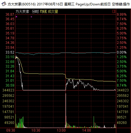 截至8月16日收盘,方大炭素跌幅9.99%,报价30.17元,跌停板微微撬开,全天换手率17.2%,总成交金额高达91.4亿元,稍高于前一个交易日的89.9亿元,市值较前一天损失59亿元。
