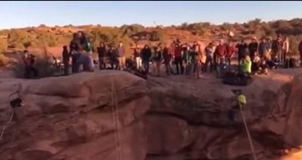 当日,他和朋友们来到一座峡谷边走绳,随行的女友对随后将要发生的事毫不知情。该男子向女友求婚时,周围的朋友挥舞着写有“你愿意嫁给我吗”的牌子,女友惊喜不已,当即答应了他。为了庆祝求婚成功,男子与未婚妻绑好安全绳,仔细收好求婚戒指,双双从悬崖边跳下,用惊险刺激的方式,纪念这人生中无比重要的一刻。